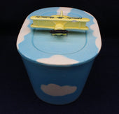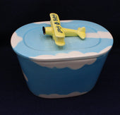 A clever piece of pottery by Utterly Butterly. A fabulous sky with clouds base and lid with a butter coloured biplane as the handle. This is one nice butter dish, the plane has a small chip to the wing, please see last photo.