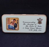 Memorabilia tin commemorating the marriage of Prince Charles and Lady Diana Spencer on a dark background