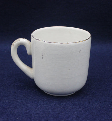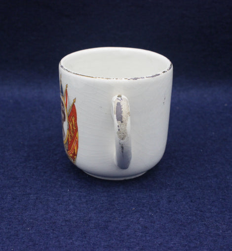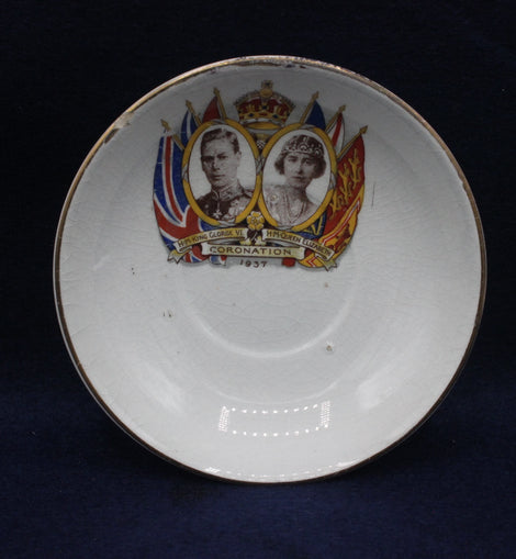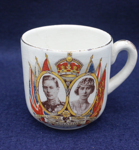 Small Coronation cup and saucer with King George and Queen Elizabeth. Fair condition, damage to glaze on cup handle. Other age related wear as per pics which is reflected in the price. Cup 58mm high saucer 110mm wide