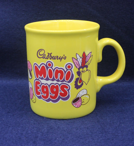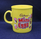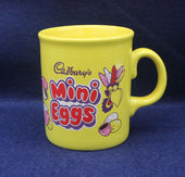 Collectable promotional mug for Cadbury's mini eggs. Bright yellow Cadbury's mug, red mini eggs logo text and chocolate filled mini eggs make for a very cheerful mug.