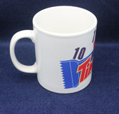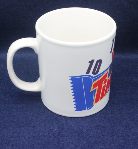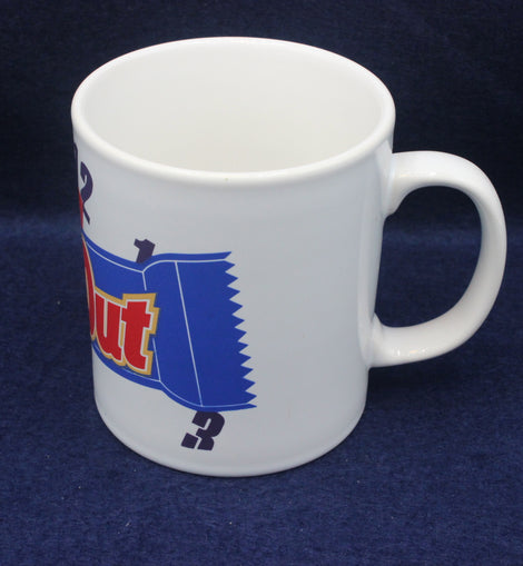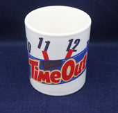Vintage white mug with Cadbury's branding. Promotional mug for Cadbury's Time Out Chocolate bar, Time Out text in red, with clock numerals on the mugs rime. Nice collectors mug.