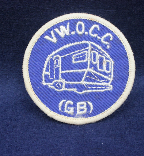 Vintage Sew on badge. Circular patch with 'V.W.O.C.C.' and a caravan illustration on a blue background