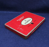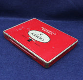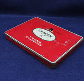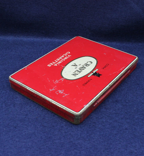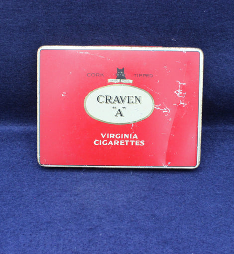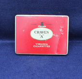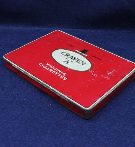 Red tin with gold accents. Craven A Virginia Cigarettes branding on the lid. Inside the lid are details of Craven A cork tipped Virginia cigarettes made specially to prevent sore throats. A well used tin with scratches and a dent to the lid. Tin still closes properly. 15 x 11 x1.5cm
