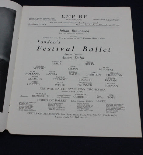 This original 1952 London’s Festival Ballet programme from the Empire Theatre, Sunderland, is a wonderful early example of British ballet ephemera. Featuring a classic red‑curtain cover design and priced in pre‑decimal currency, it reflects the elegance and theatrical style of post‑war touring ballet companies. With Anton Dolin listed as Artistic Director, this programme comes from a formative period in the company’s history, when Festival Ballet was rapidly gaining national recognition.