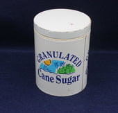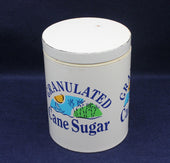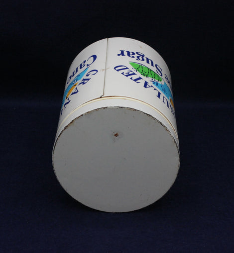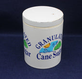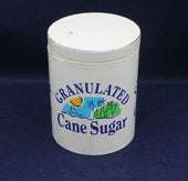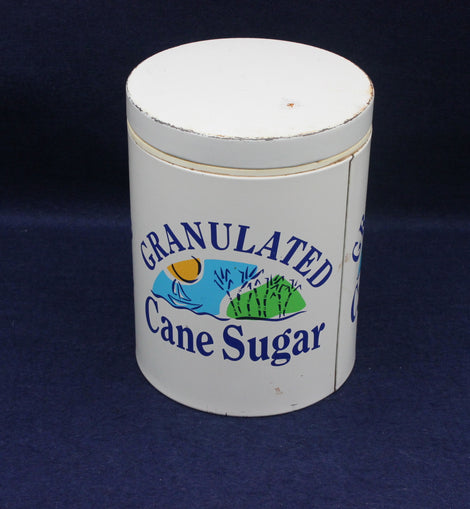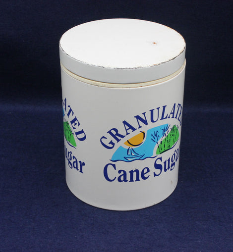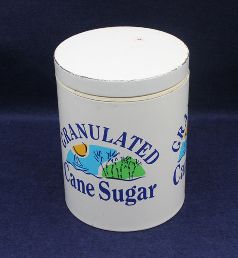 This vintage Granulated Cane Sugar tin is a classic example of 1970s British kitchen storage design, featuring a bold, colourful illustration with a sunburst, ocean waves and stylised sugarcane. The bright graphic style and simple typography are unmistakably mid‑70s, reflecting the era’s love of cheerful, decorative kitchenware.