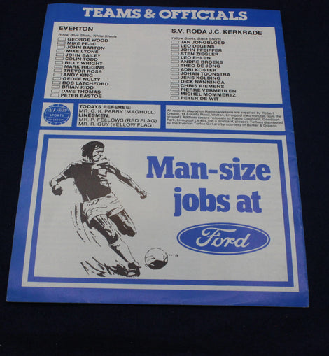 This original Everton vs S.V. Roda match programme from 1979 is a superb piece of international football memorabilia, capturing a rare friendly fixture between Everton and Dutch side Roda JC Kerkrade.
