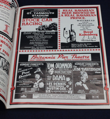 This original Peter Jay Circus Souvenir Programme from 1984 is a colourful and nostalgic 14 page piece of Great Yarmouth entertainment history. Produced for the summer season, it showcases the Jay family’s famous circus, known for its high‑energy acts, striking animal imagery and the long‑standing tradition of spectacular seaside shows.