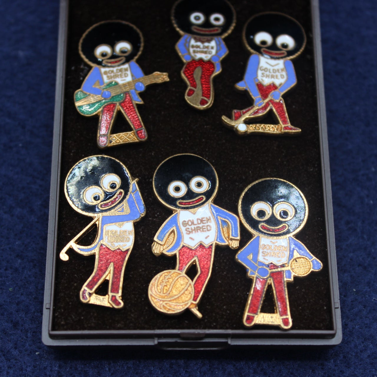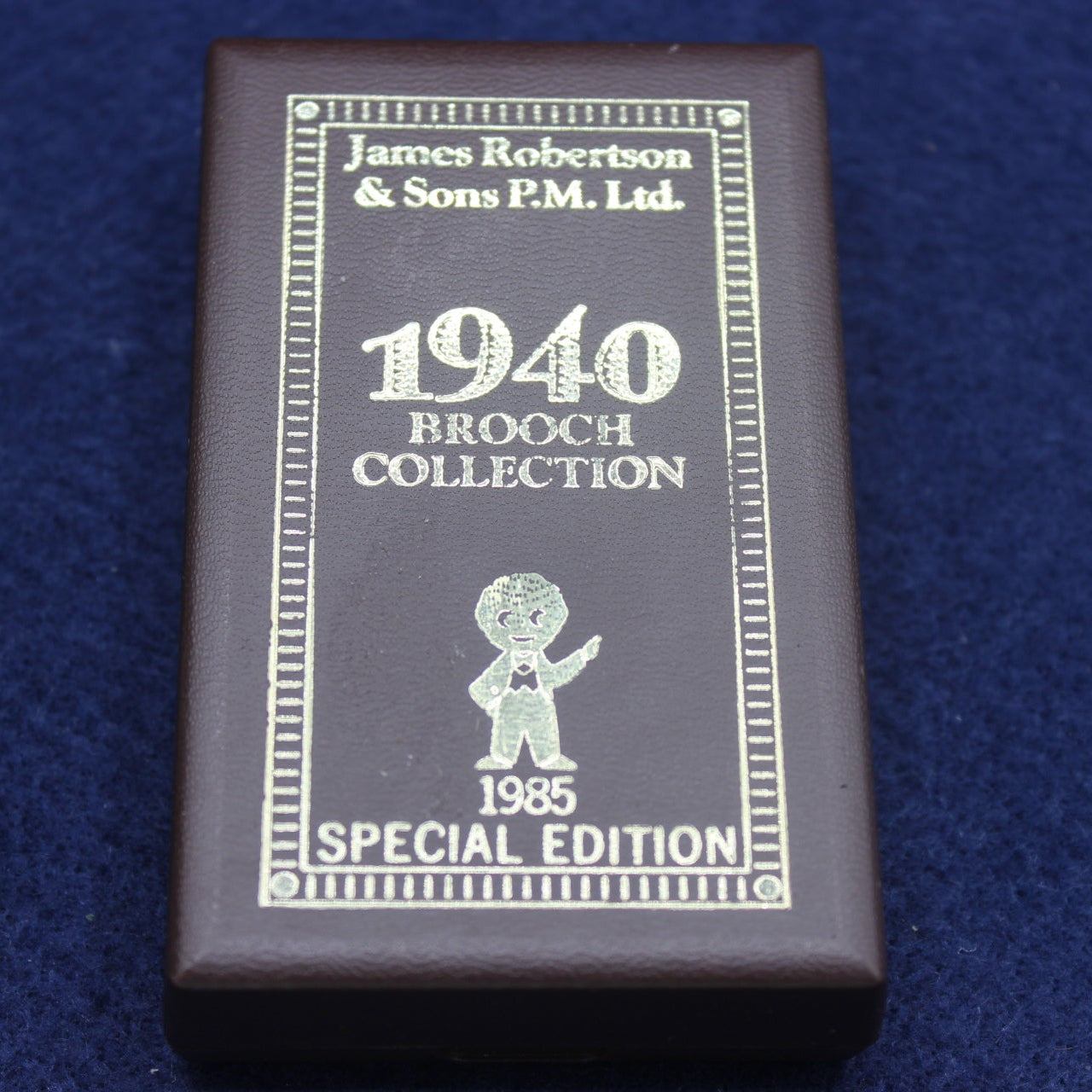 A scarce Special Edition Golly brooch collection, issued by James Robertson & Sons in 1985 to commemorate the classic 1940 brooch series. This original boxed set contains six brooches, each housed in the factory‑issued plastic presentation case.