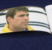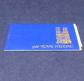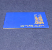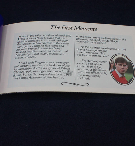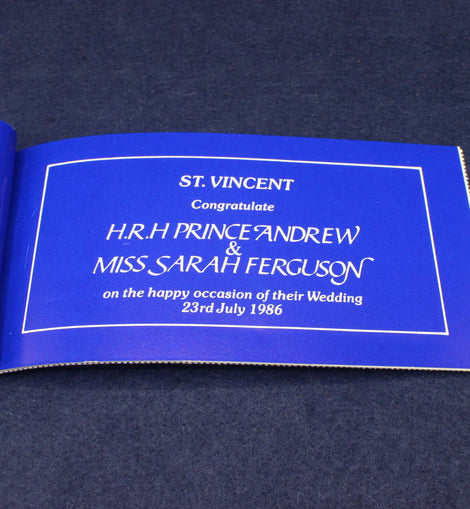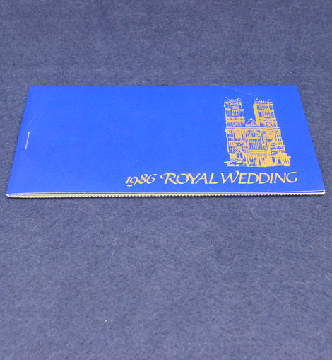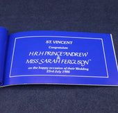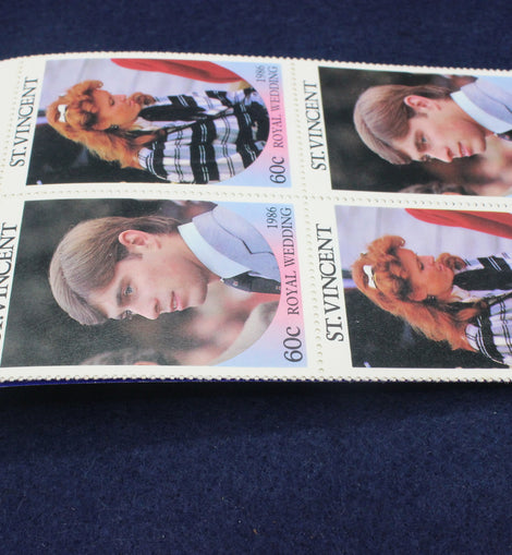 A commemerative stamp booklet celebrating the 1986 wedding of Prince Andrew to Sarah Ferguson. This one is sold with the two pages of stamps in place. There are literature pages with colour pictures entitled: