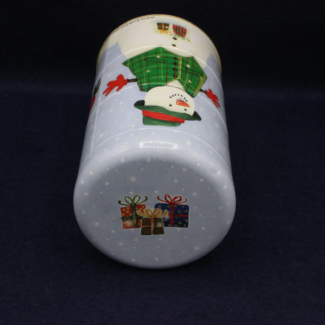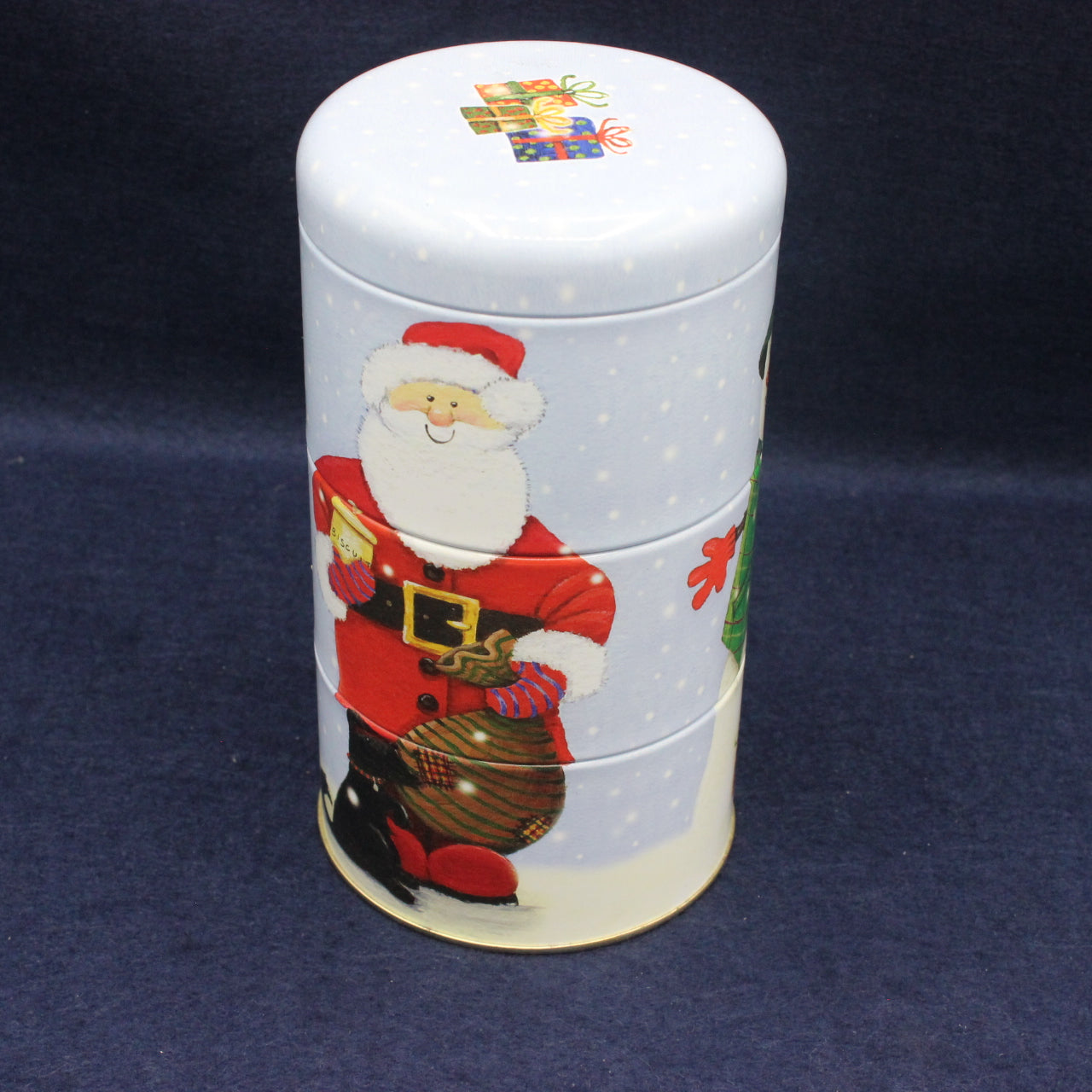 The tin features bold festive artwork with a cheerful Santa illustration and colourful present‑themed lid, giving it strong visual appeal for seasonal décor or year‑round display. Its stackable design makes it both decorative and functional, ideal for collectors of sweet tins, Christmas tins, and unusual packaging formats. Light age‑related wear adds authenticity while preserving the charm and colour of the original graphics.