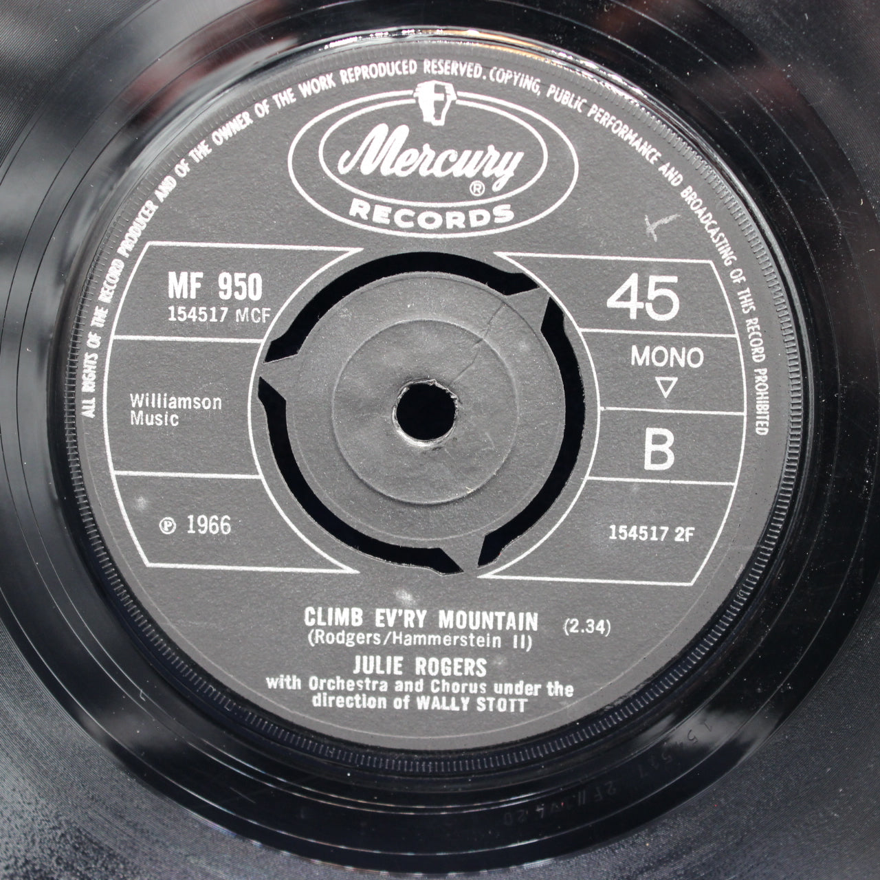 A vintage 1966 UK 45 rpm vinyl single on the Mercury label featuring Julie Rogers, performing “Climb Ev’ry Mountain” backed with “While the Angelus Was Ringing”. Known for her rich, expressive vocal style, Rogers brings a dramatic and melodic quality to both tracks, giving this release strong appeal for fans of 1960s pop and orchestral ballads.
