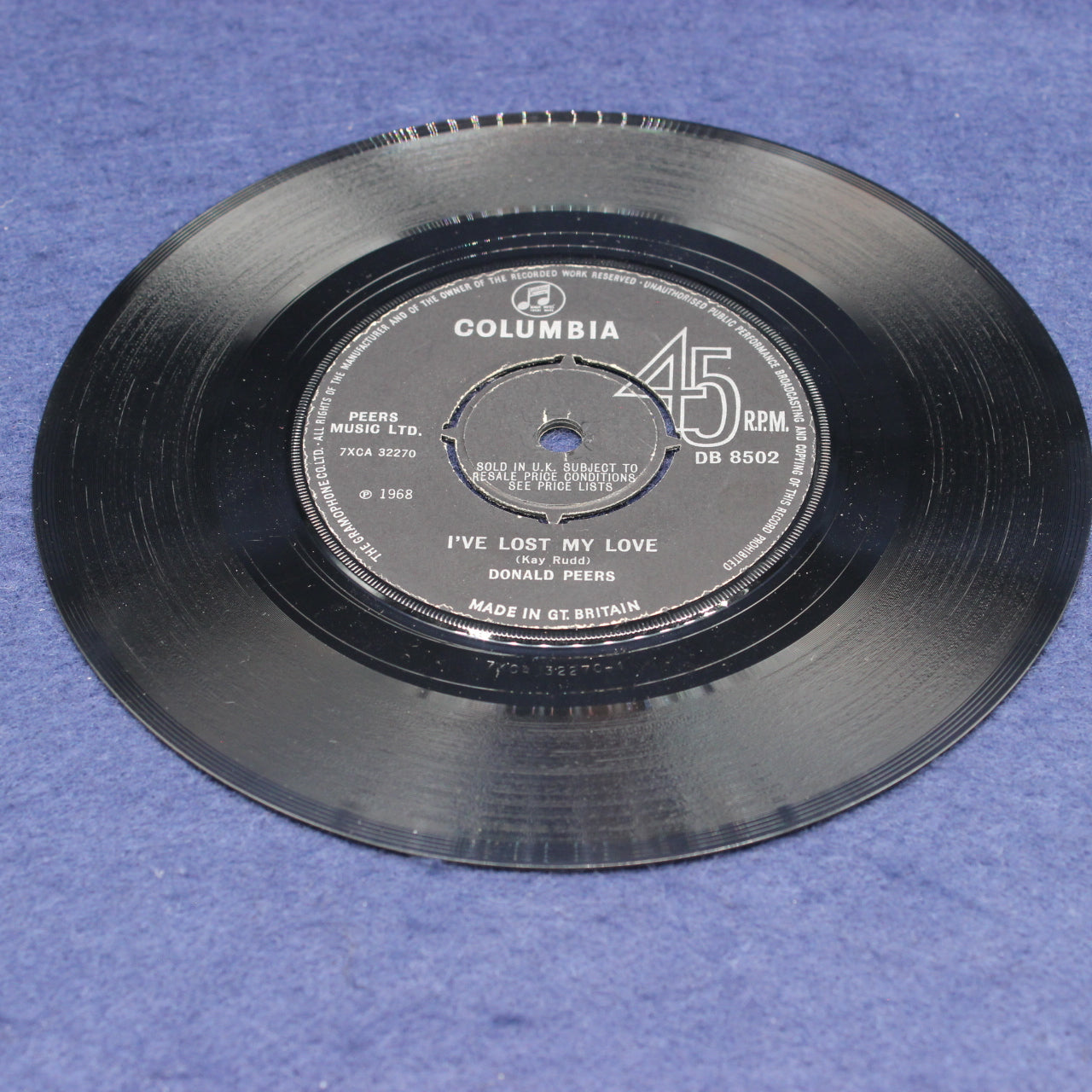 A vintage 45 rpm vinyl single from 1968 featuring Donald Peers, performing “Please Don’t Go” backed with “I’ve Lost My Love”. Peers’ warm, traditional vocal style gives both tracks a classic late‑60s light‑pop feel, bridging the gap between his earlier dance‑band era success and the changing musical tastes of the decade.