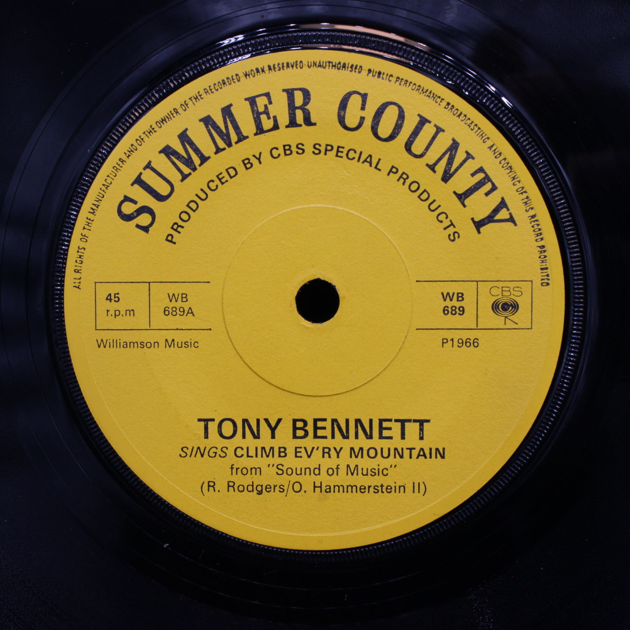 A vintage 45 rpm vinyl single record from 1966 pairing two classic musical‑theatre performances: “Climb Ev’ry Mountain” sung by Tony Bennett, backed with “Do Re Mi” performed by Doris Day. Both tracks draw on the rich tradition of stage and screen musicals, with Bennett delivering a powerful, inspirational reading and Day offering her trademark bright, melodic charm.