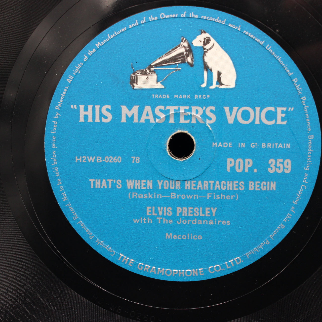 A vintage 1957 78 rpm shellac record on the His Master’s Voice label featuring Elvis Presley, performing the rock‑and‑roll classic “All Shook Up” backed with “That’s When Your Heartaches Begin”. This late‑period shellac issue captures the moment when rock ’n’ roll was reshaping the British record market, with HMV issuing some of the earliest UK pressings of Presley’s breakthrough hits.