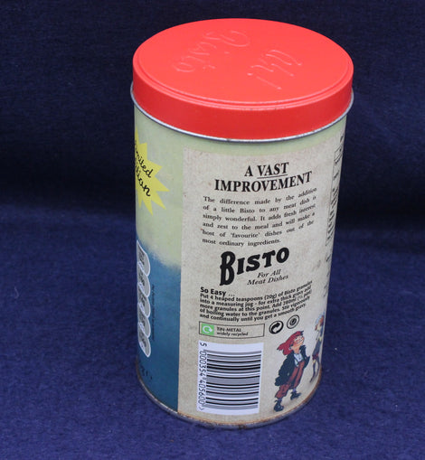 A clean, collectible piece of promotional packaging, this Bisto tin makes a perfect display item for collectors of advertising tins, decorators seeking a retro accent, or anyone who enjoys quirky food memorabilia.