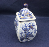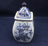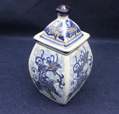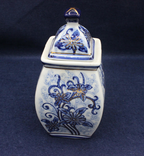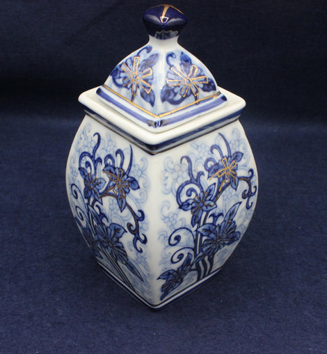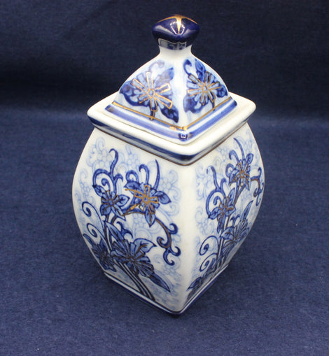 The jar has a square, gently tapering body and a matching pyramid‑shaped lid topped with a dark blue finial, giving it a refined, traditional look. The hand‑painted floral motifs wrap around all four sides, combining deep cobalt tones with delicate gold touches that catch the light beautifully.