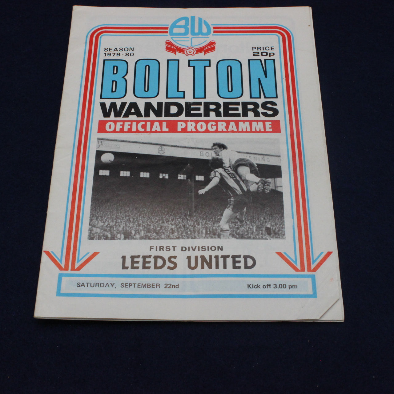 This original Bolton Wanderers vs Leeds United programme from 22 September 1979 is a fantastic piece of First Division football history. Featuring a bold action‑shot cover and full interior team line‑ups, it captures a classic late‑70s clash between two well‑supported northern clubs.