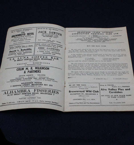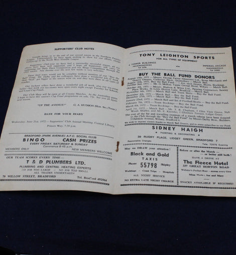 This original Bradford Park Avenue vs Stafford Rangers programme from 1 May 1972 is a classic piece of non‑league football memorabilia. Issued for a Northern Premier League fixture at Park Avenue, the programme features full team line‑ups, match officials, and a rich selection of local advertising — from bingo halls to builders and carpet warehouses.