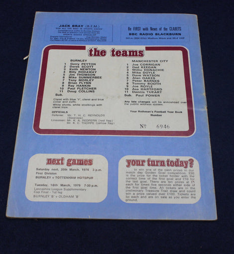This original Burnley vs Manchester City match magazine from 13 March 1976 is a superb piece of First Division football history. Issued as Claret & Blue News and Views (Volume 6, Match 20), the programme features a striking action photograph on the cover and full interior team line‑ups for both clubs.