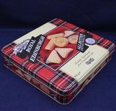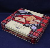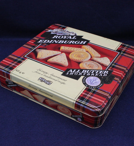 Scotland Royal Edinburgh short bread tin. Tartan themed tin with castle motif and shortbread images. Used tin with some scratches / marks as per pictures. Approximate Size 23 x 23 x 5cm