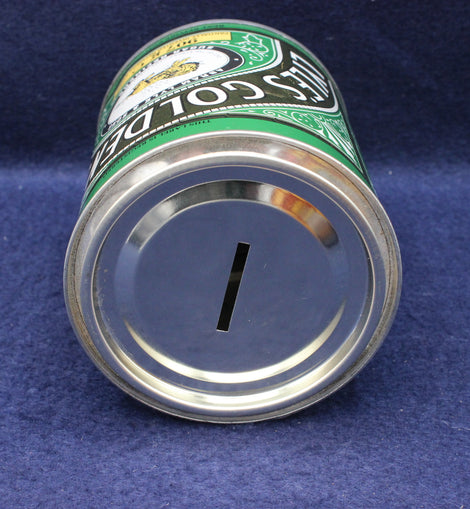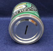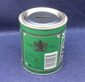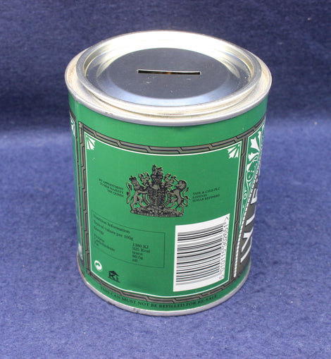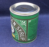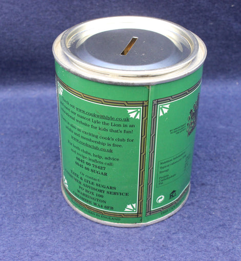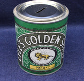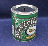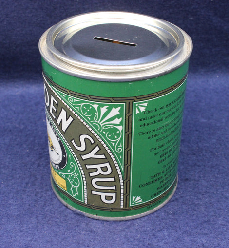 The Tate & Lyle Golden Syrup money box is a collectible tin designed to resemble the iconic green-and-gold syrup can, produced as a promotional or commemorative item. It combines advertising nostalgia with practical use as a piggy bank.