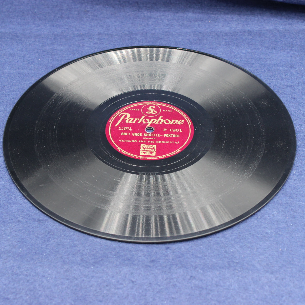 A vintage 78 rpm shellac record on the Parlophone label featuring Geraldo and His Orchestra, performing “Soft Shoe Shuffle Foxtrot” backed with “The Autumn Slow Foxtrot”. A classic dance‑band era release, showcasing the smooth arrangements and polished orchestral style that made Geraldo one of Britain’s most popular bandleaders of the 1930s and 40s.