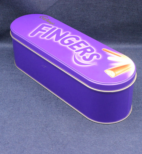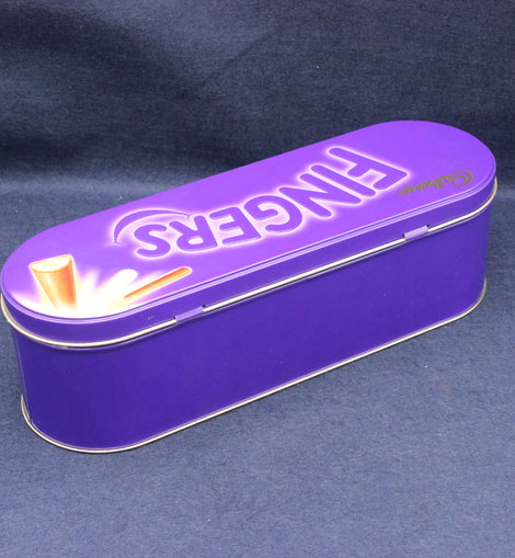 The tin’s elongated shape mirrors the form of the chocolate biscuit fingers inside, giving it strong visual appeal and making it ideal for display in kitchens, sweet‑tin collections or retro‑style shelving. The graphics remain bright and crisp, with the familiar Cadbury script and a tempting illustration of the chocolate fingers — one broken to reveal the biscuit centre. Light age‑related wear adds authenticity without detracting from its decorative charm.