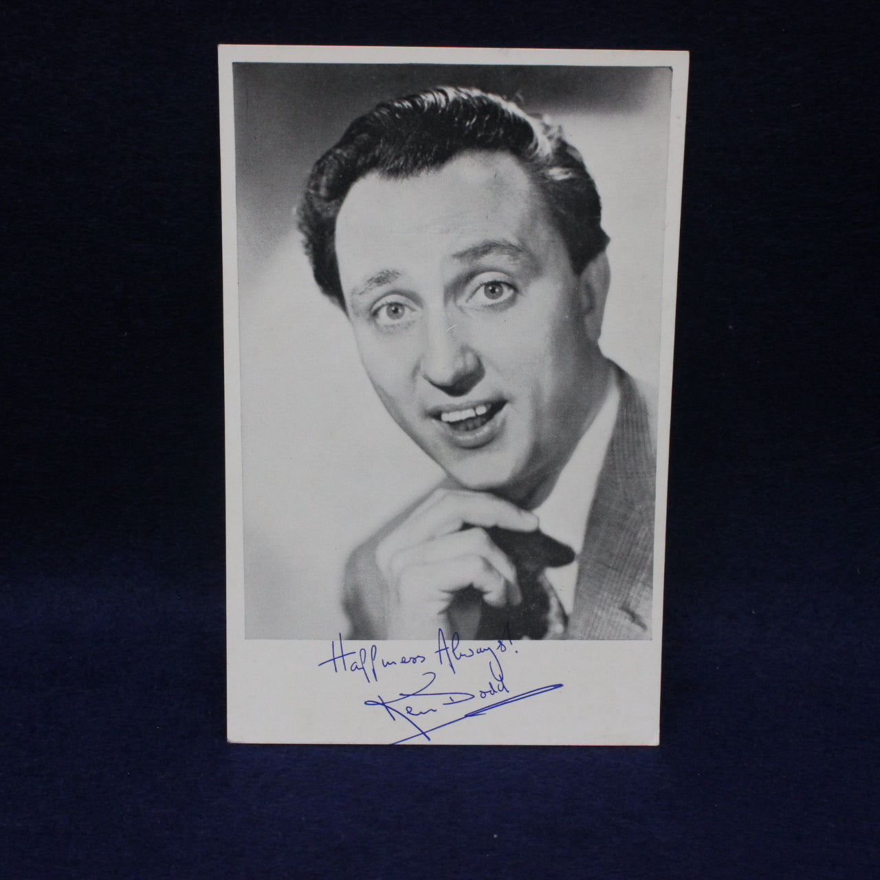 A photo print of Ken Dodd, the much‑loved English comedian and entertainer. Known for his quick wit, eccentric stage presence, and trademark tickling stick, Dodd became one of Britain’s most enduring comic personalities. This early signed portrait captures his charm and humour during the formative years of his career.