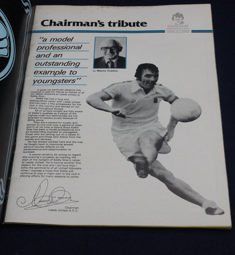 Eddie Gray — famed for his dribbling ability, football intelligence, and unforgettable solo goals — enjoyed a long and loyal career at Elland Road. His 1978–79 testimonial year honoured his exceptional service, flair, and enduring connection with the Leeds United faithful. Testimonial brochures like this were produced as keepsakes for supporters, filled with photographs, tributes, and reflections on a player’s contribution to the club.
