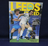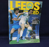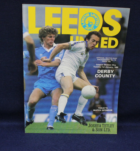 Soccer match program featuring Leeds United and Derby County on a blue background