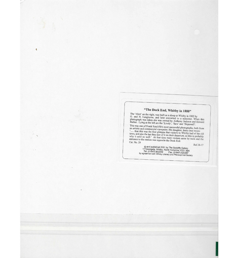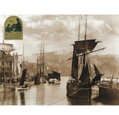 A nostalgic vintage print from The Sutcliffe Gallery, Whitby, titled The Dock End, Whitby Harbour in 1890. The image depicts sail boats moored at the dock end, with Whitby’s distinctive stone buildings rising behind them.