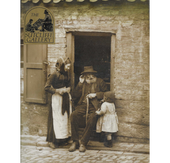 A nostalgic vintage print from The Sutcliffe Gallery, Whitby, titled What Did You Say, My Dear?. The image depicts an elderly man sitting in his cottage doorway, holding a walking stick. He sits upright, hand to his ear, listening intently to a little girl who stands beside him. The composition captures both tenderness and humour, reflecting Sutcliffe’s gift for portraying everyday human connection in Whitby’s fishing community.