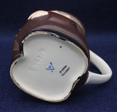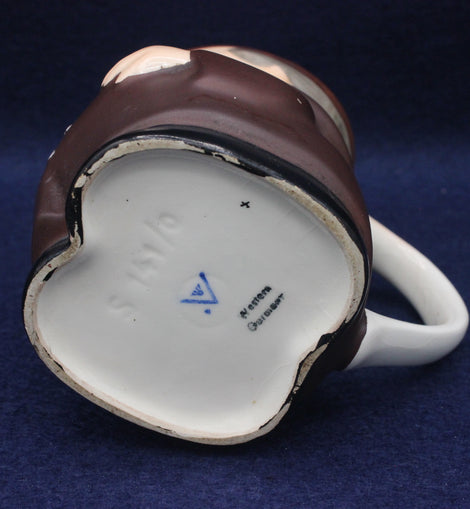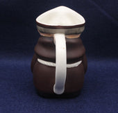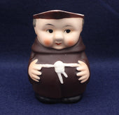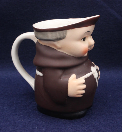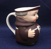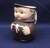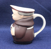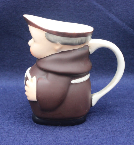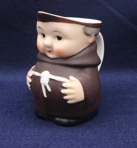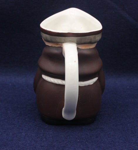 Lovely small fat friar jug. Deep chocolate colouration. Friar holding his belly. 10.5cm high