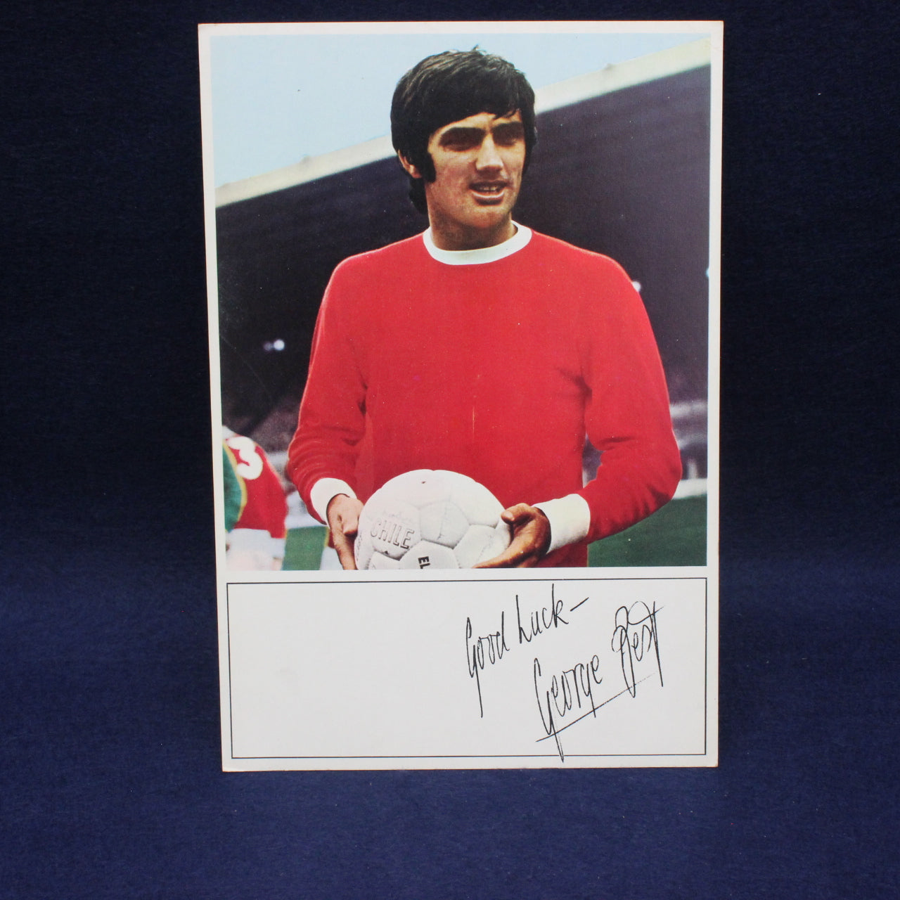 George Best (1946–2005) is widely regarded as one of the greatest footballers of all time, celebrated for his dazzling skill, charisma, and impact on Manchester United during the 1960s and 1970s. Promotional cards featuring his image and autograph were popular keepsakes, treasured by fans and now highly collectible.