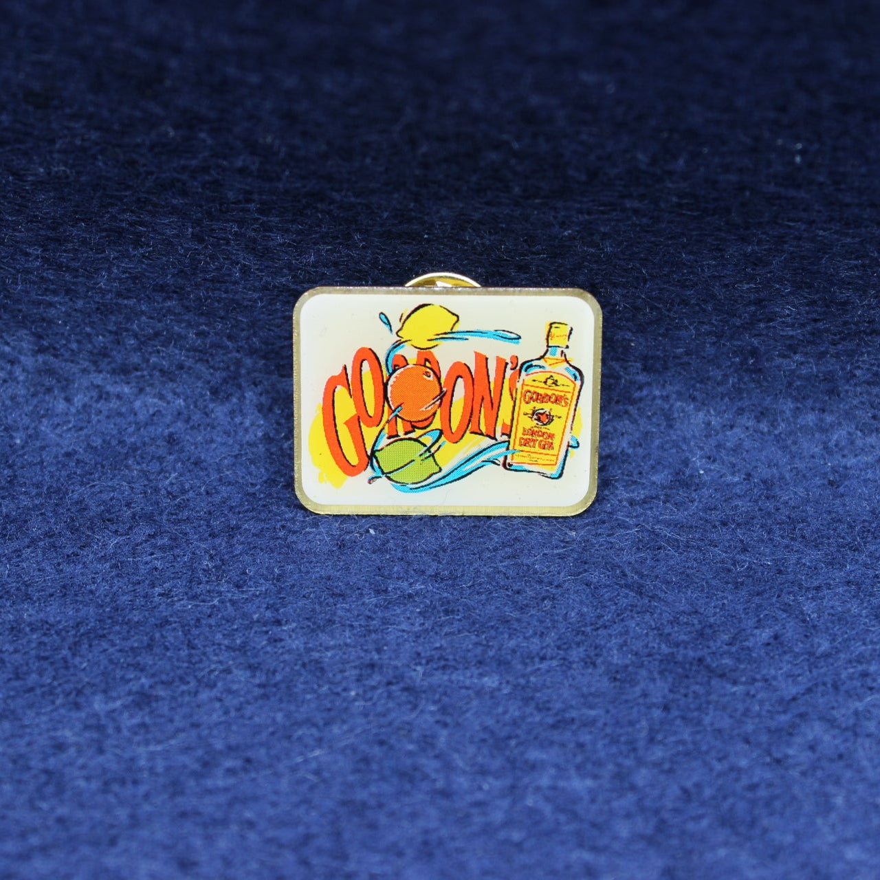 A vibrant rectangular enamel badge promoting Gordon’s London Dry Gin, featuring the classic red‑and‑orange GORDON’S branding alongside a stylised bottle illustration. The background includes citrus motifs and splash graphics, echoing the brand’s long association with refreshing gin‑and‑citrus serves. This is a lively piece of late‑20th‑century drinks‑trade advertising, ideal for collectors of spirits memorabilia, barware history, or British brand promotion.
