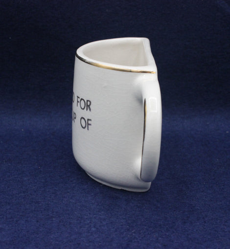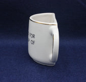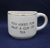 Vintage half of a cup. White ceramic tea cup with gold accents to the rim and handle. Gold text reads: You asked for half a cup of tea.