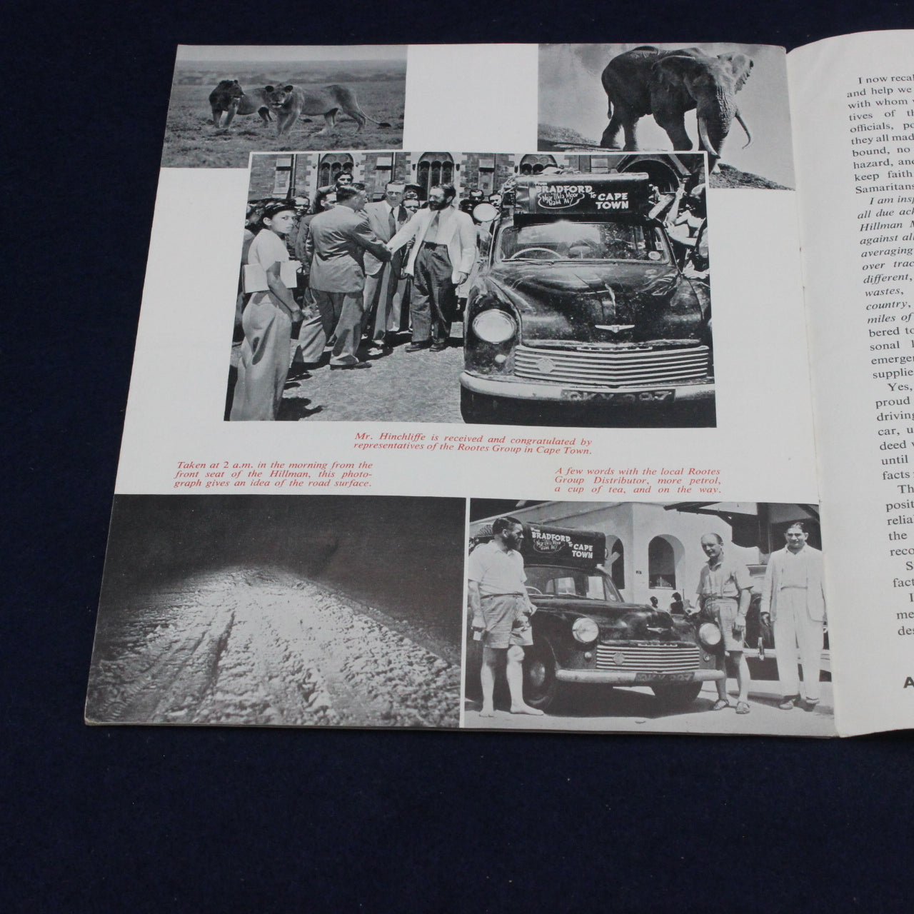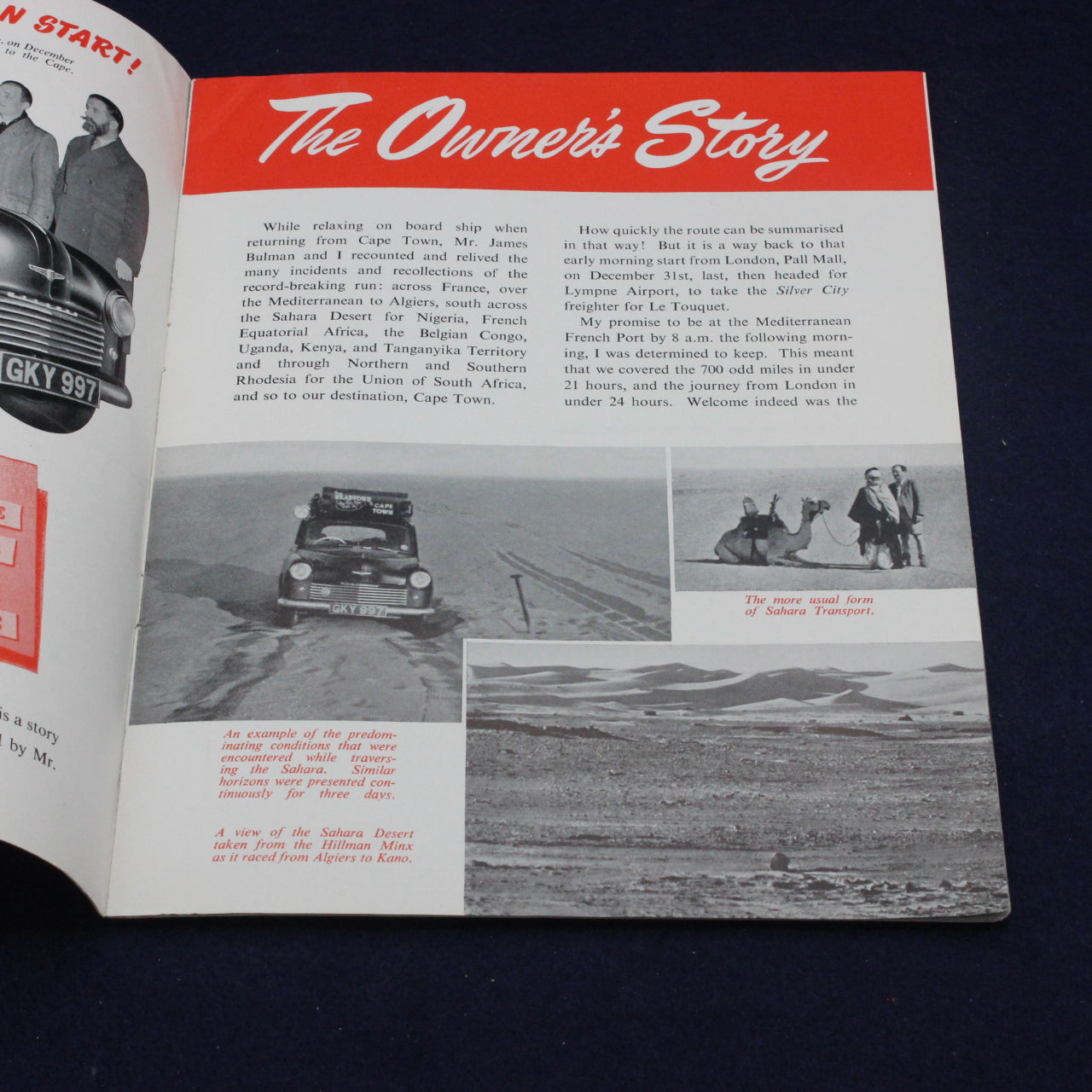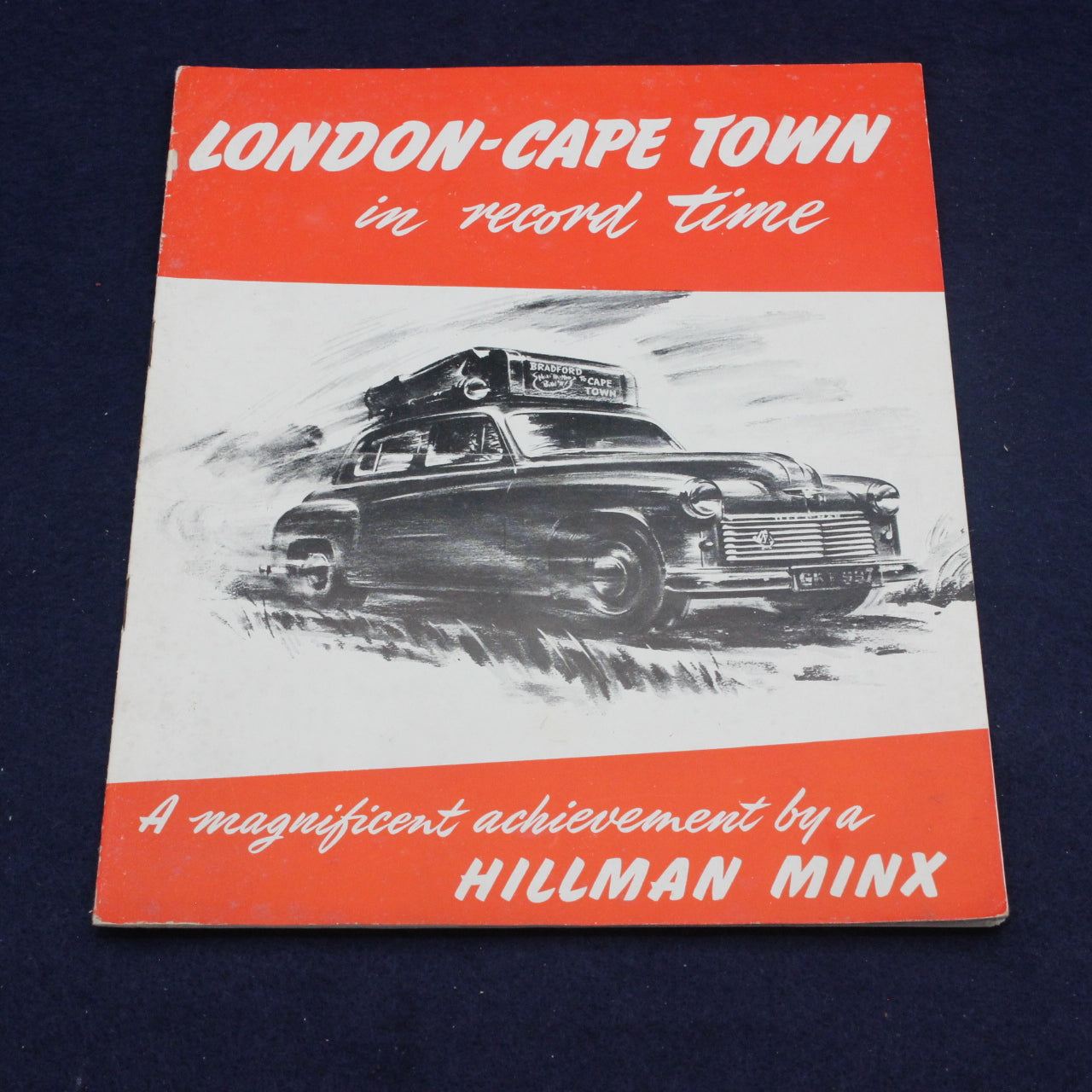 Celebrate one of the great feats of mid‑century motoring with this original promotional booklet commemorating the London–Cape Town record run achieved by the Hillman Minx.