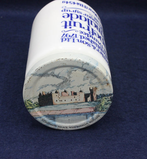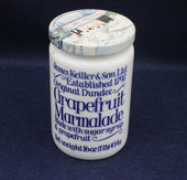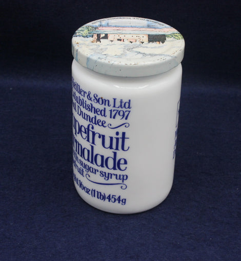 The jar features the Original Dundee Grapefruit Marmalade label, complete with weight details and period typography. The decorative lid with its illustrated building adds extra display appeal, making this a lovely piece for collectors of kitchenalia, Scottish food heritage, or ceramic advertising pots. Light age‑related wear gives it an authentic, well‑kept vintage character without detracting from the clarity of the print.