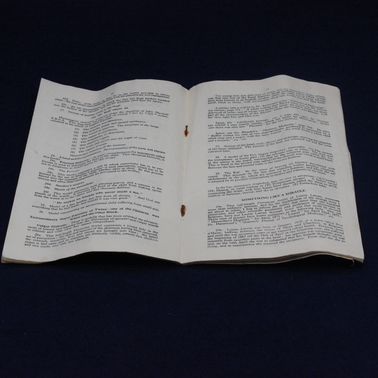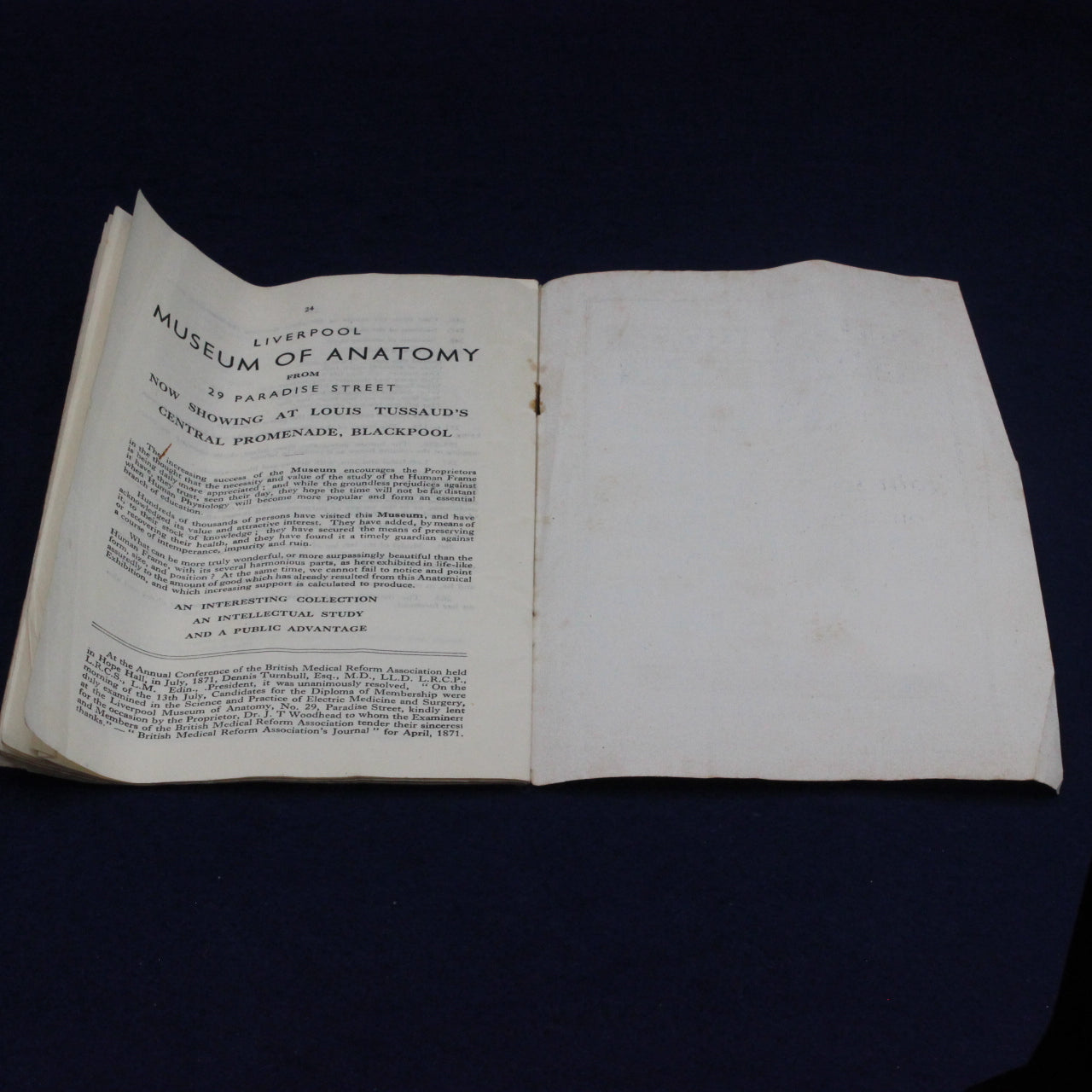Printed in blue ink with ornate borders and priced at threepence, this catalogue is ideal for collectors of oddities, medical history ephemera, Blackpool memorabilia, and vintage museum publications. A striking survivor from a time when anatomical exhibitions were both controversial and hugely popular.