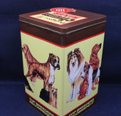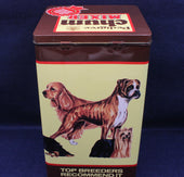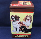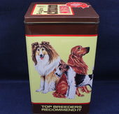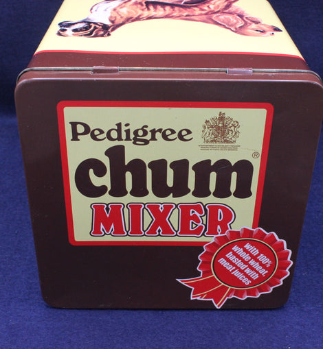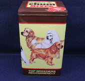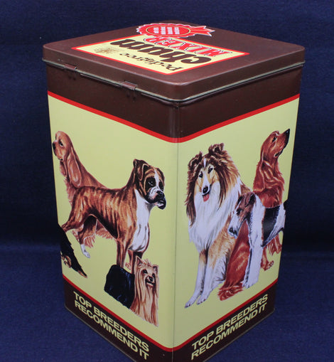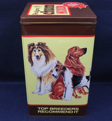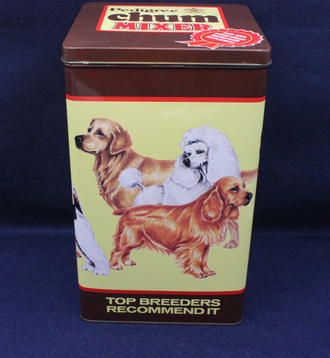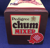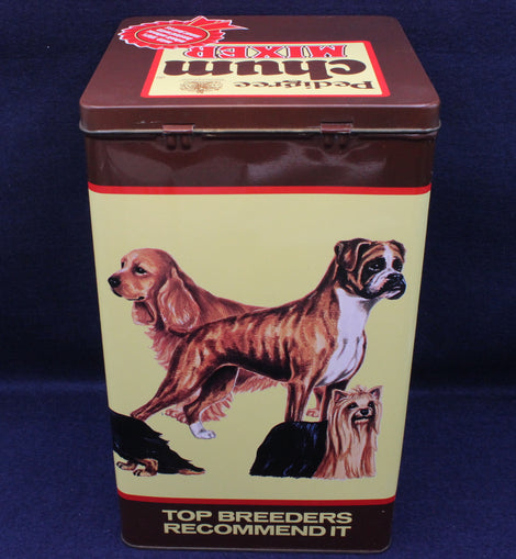 Quite a rare tin. This tall Pedigree Chum Mixer tin. Slogan on a bottom brown band "Top Breeders Recommend it." Images of different breeds of dog on each side. Approximate Size 26 x 15 x15cm.
