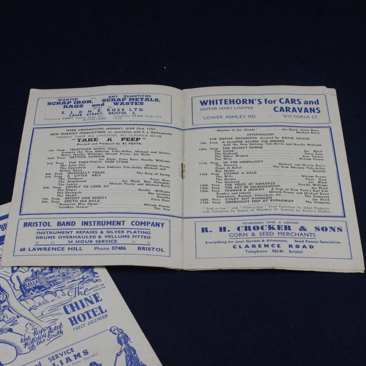 This pair of original 1952 New Empire Bristol programme flyers offers a charming glimpse into early‑1950s entertainment culture and local advertising. Each flyer features period artwork and promotional content, including holiday accommodation at The Chine Hotel in Bournemouth and cycle sales and servicing from Max Williams of Lawrence Hill.