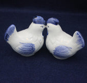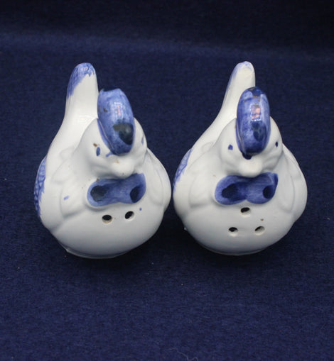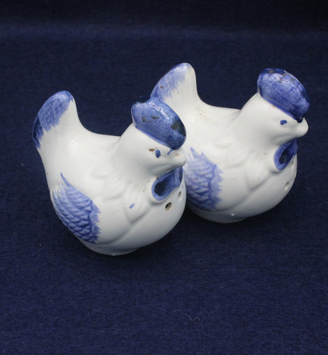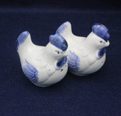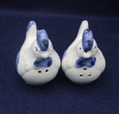 Exquisite pair of hens in the form of salt and pepper shakers. Lovely white ceramic pottery hens with dainty blue wings and tail feathers.