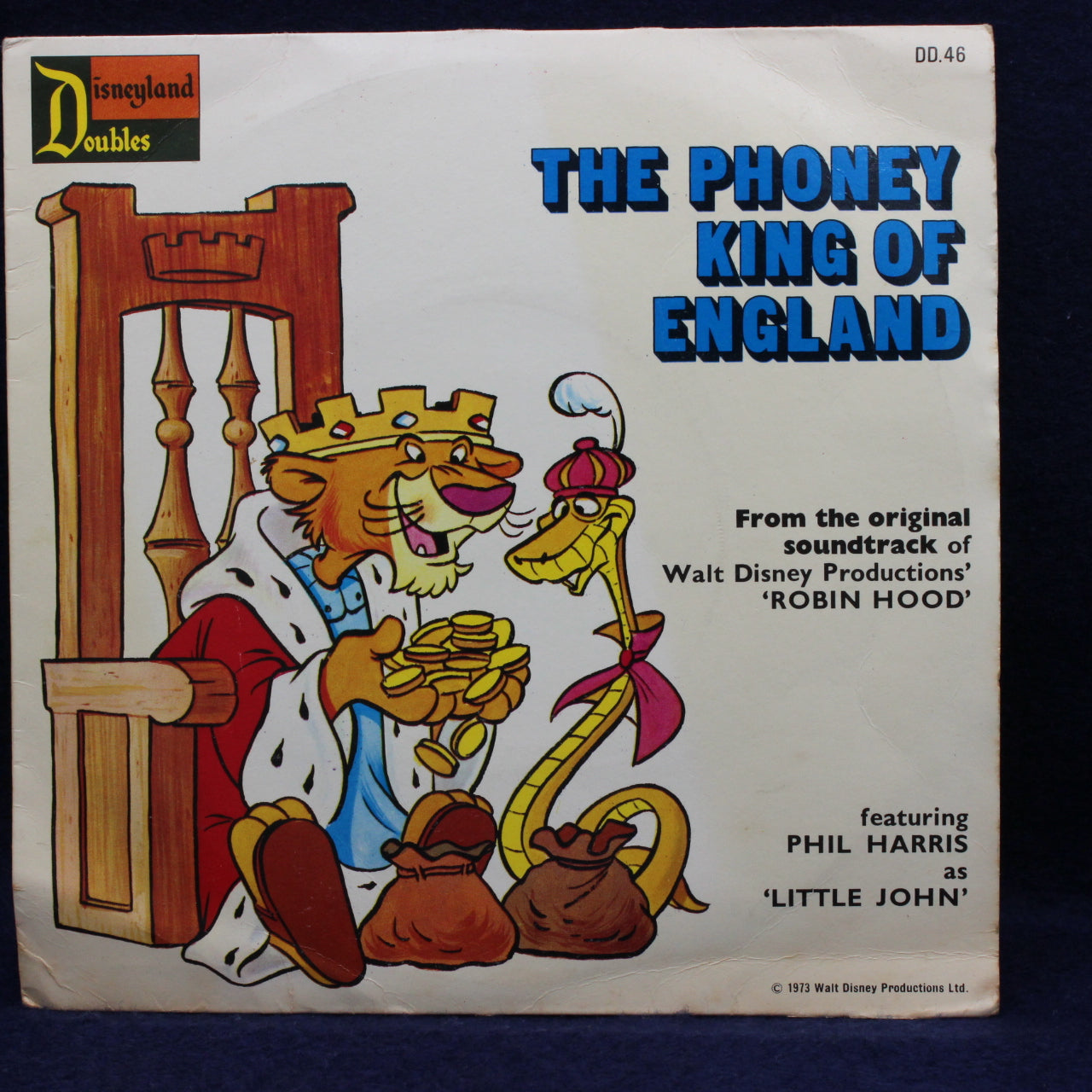 Issued in 1973 as part of the Disneyland Doubles series, this charming 7‑inch single brings together two much‑loved songs from Disney’s animated retellings of classic tales. Released in the UK under catalogue number DD.46, the record features Phil Harris performing The Phoney King of England on one side, with Roger Miller’s gentle and reflective Not In Nottingham on the reverse. Pressed at 45rpm and presented on the familiar Disneyland label, the single captures the distinctive musical style that defined Disney’s productions of the early seventies.