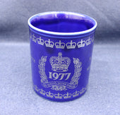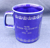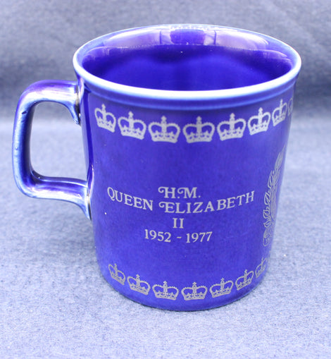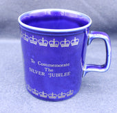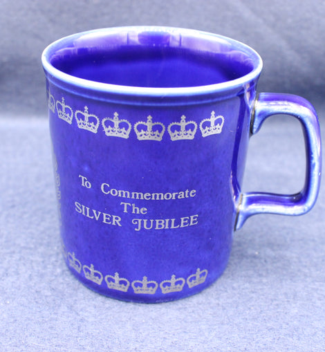 Stunning royal blue to commemorate mug celebrating the Queen Elizabeth's Silver Jubilee in 1977. Text and graphics in silver. Nice condition.