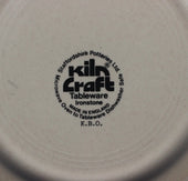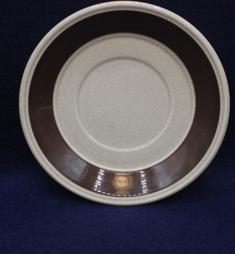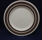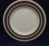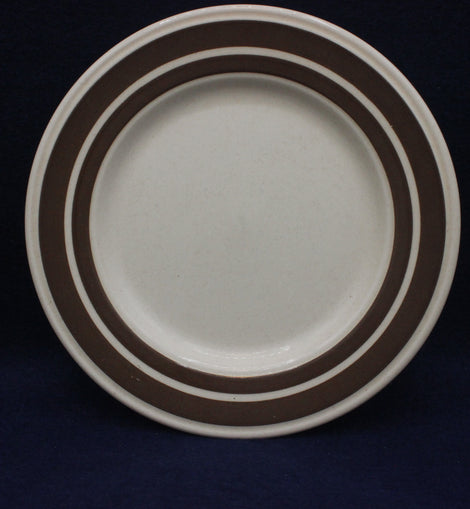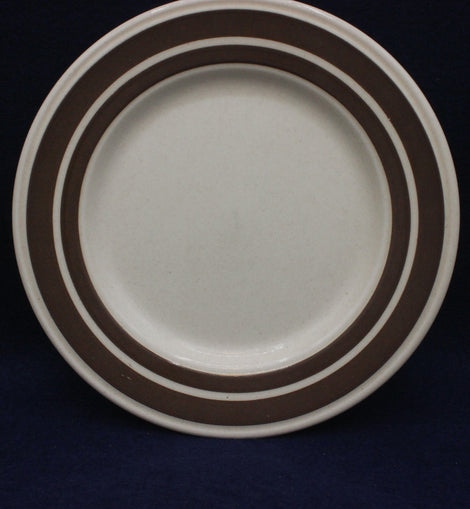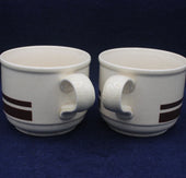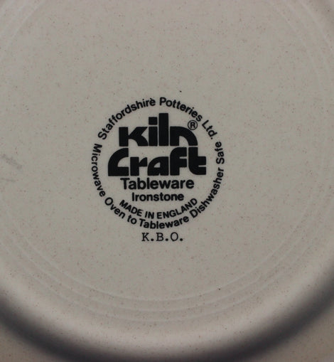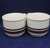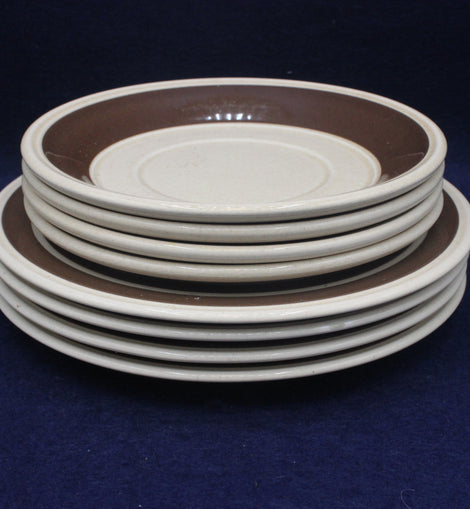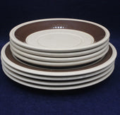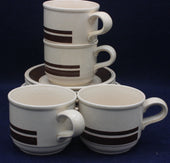 Staffordshire Pottery Kiln Craft Tableware Ironstone Set. 4 Cups, 4 Saucers, 4 Side Plates in cream and chestnut brown.