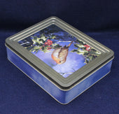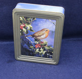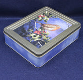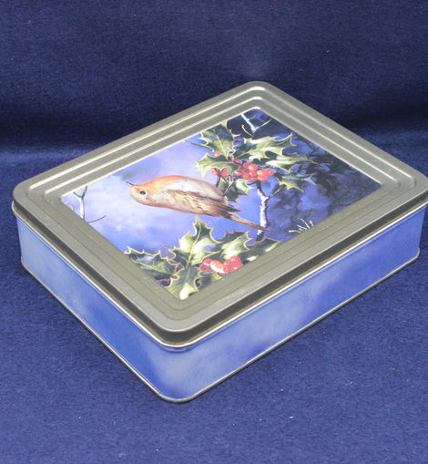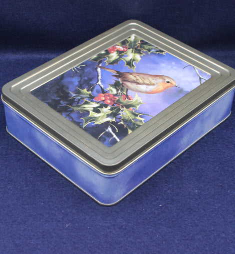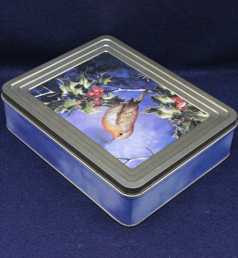 A festive Ringtons Assorted Toffee tin, decorated with a charming image of a robin red breast perched on a berry‑laden holly tree. The lid is finished with a gold‑coloured rim, while the base is a soft pastel sky blue, giving the piece a seasonal yet elegant look.