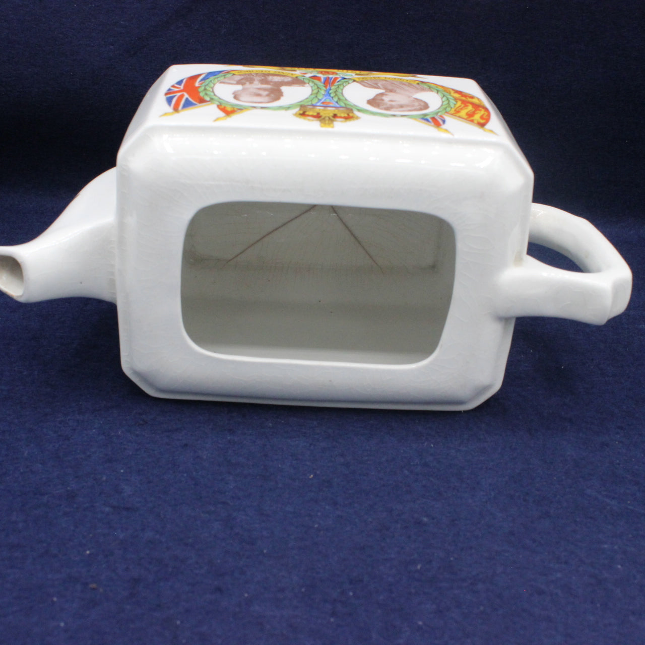 The teapot features a distinctive rectangular form decorated with colourful portraits of King George V and Queen Mary, framed by laurel wreaths, flags, and a crown — a classic example of early 20th‑century British royal memorabilia.