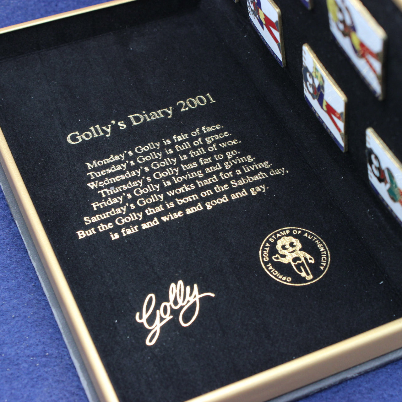 Issued in 2001 as one of the final themed collections before the Golly scheme came to an end, the Golly Diary – Days of the Week boxed set brings together seven enamel badges inspired directly by the traditional rhyme printed in gold on the diary‑style case. Only 3,000 sets were produced, and complete boxed examples are becoming increasingly scarce as many collectors now remove the badges for framing or display.