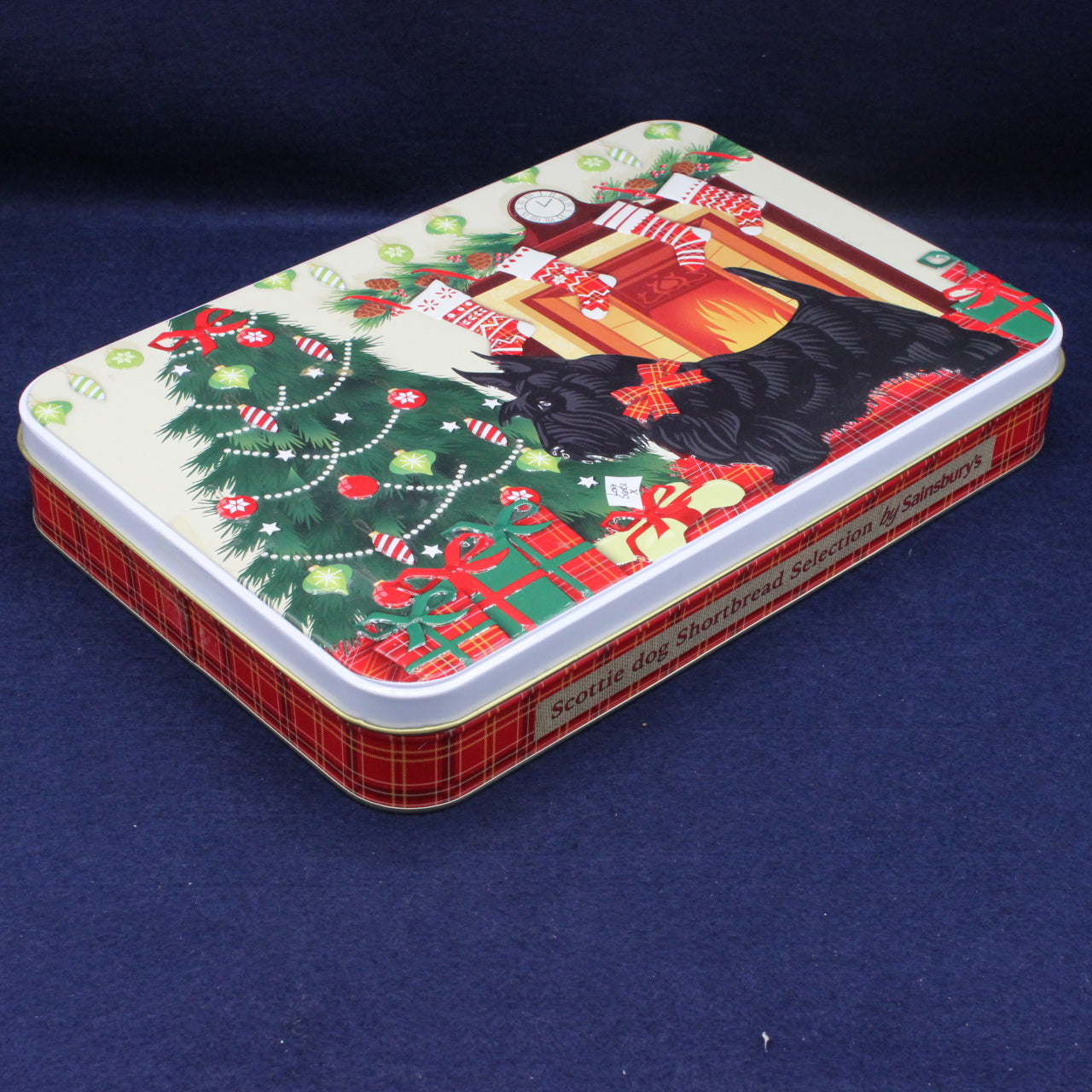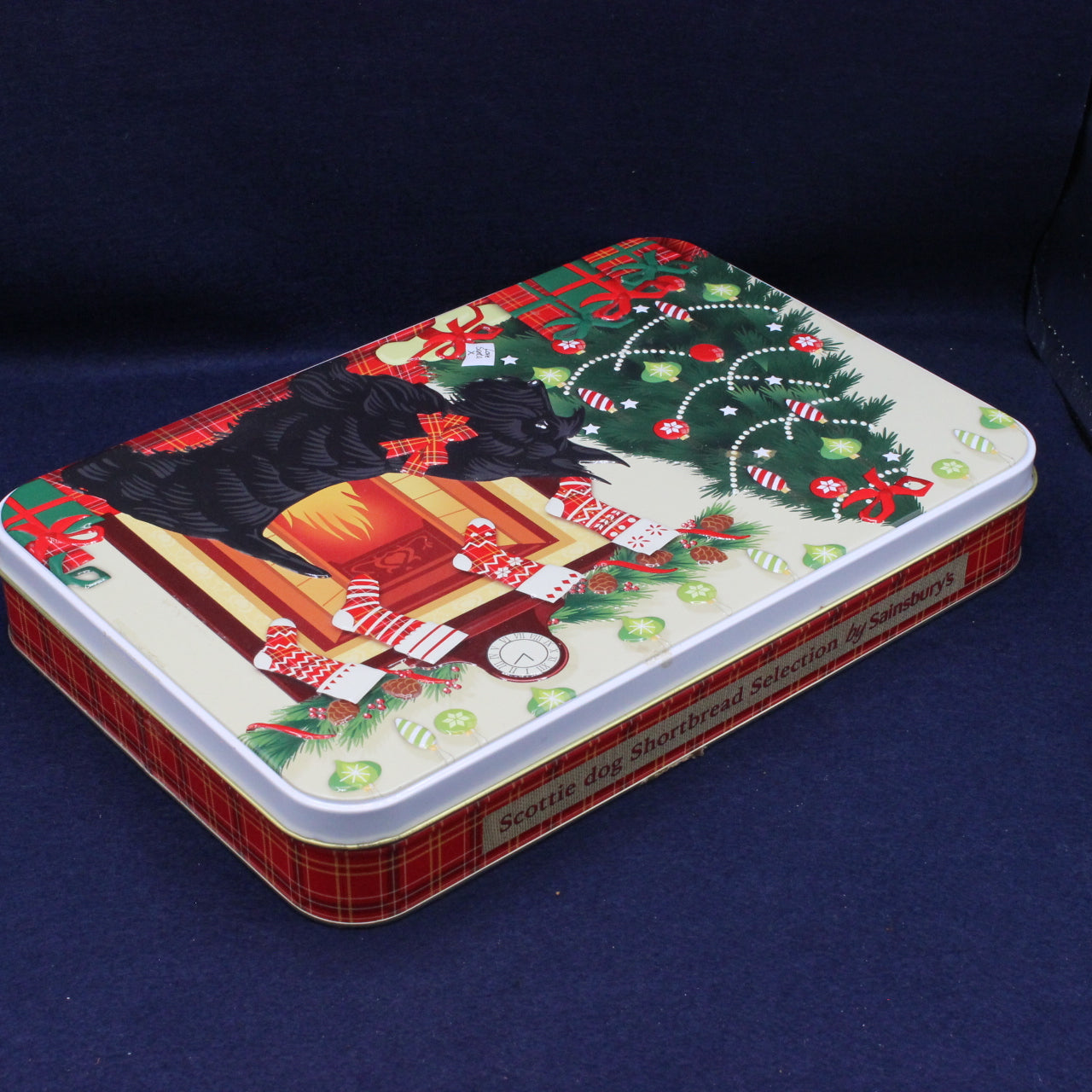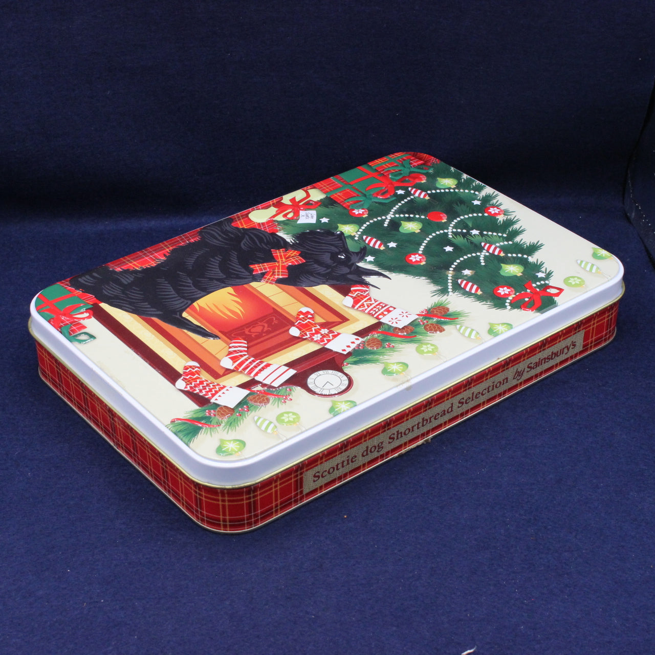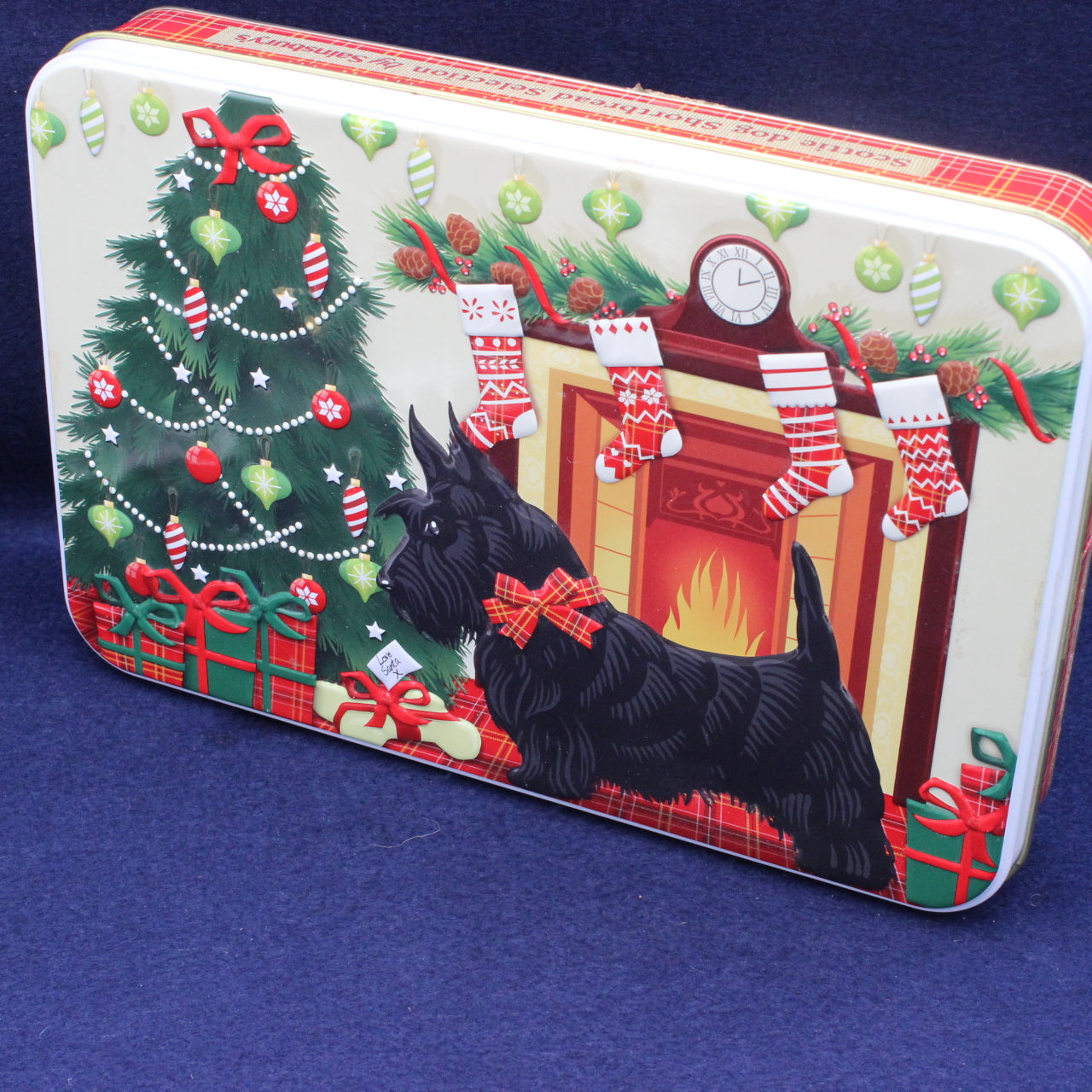 An awesome large tin for the collector’s shelf, decorated with a festive Scottie dog Christmas front room theme. The lid features an embossed design with a Christmas tree, presents, stockings, and a warm open fire, capturing the cosy spirit of the season.