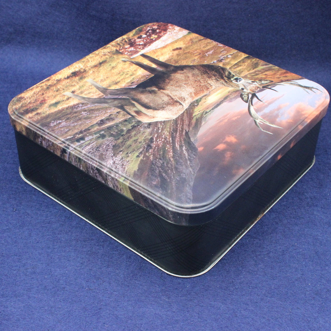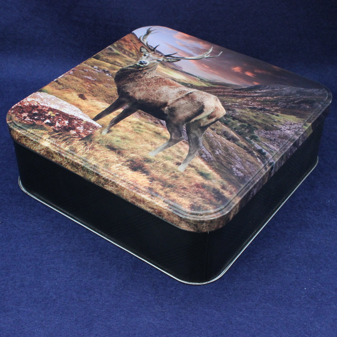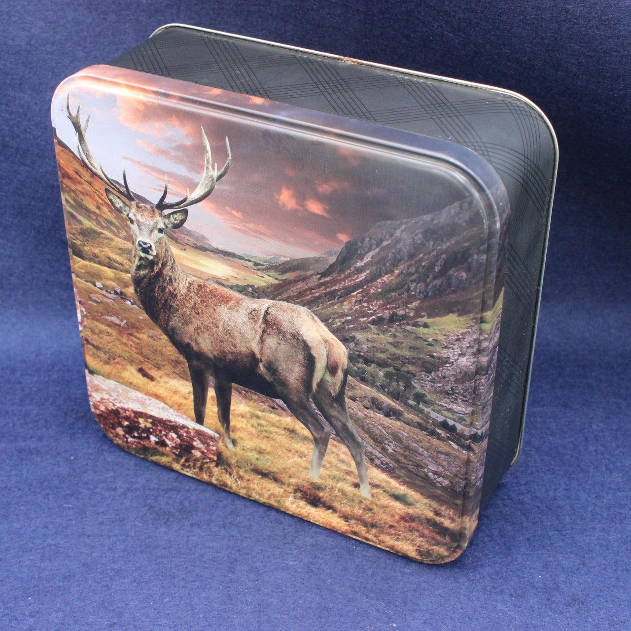 A charming Scottish shortbread collectors tin featuring a proud stag set against a Highland landscape. The square format, warm tones, and classic scenic artwork capture the traditional style long associated with Scottish biscuit tins — decorative, giftable, and designed to be reused around the home.